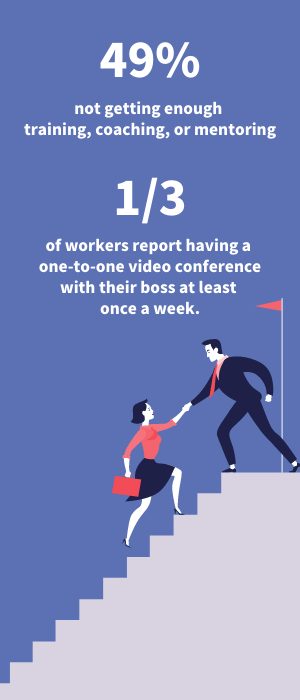 Forty-nine percent say they lack training, coaching, or mentoring to advance their careers. Only a third of workers report having a regularly scheduled one-to-one video conference with their boss at least once a week. These numbers aren’t inspiring.